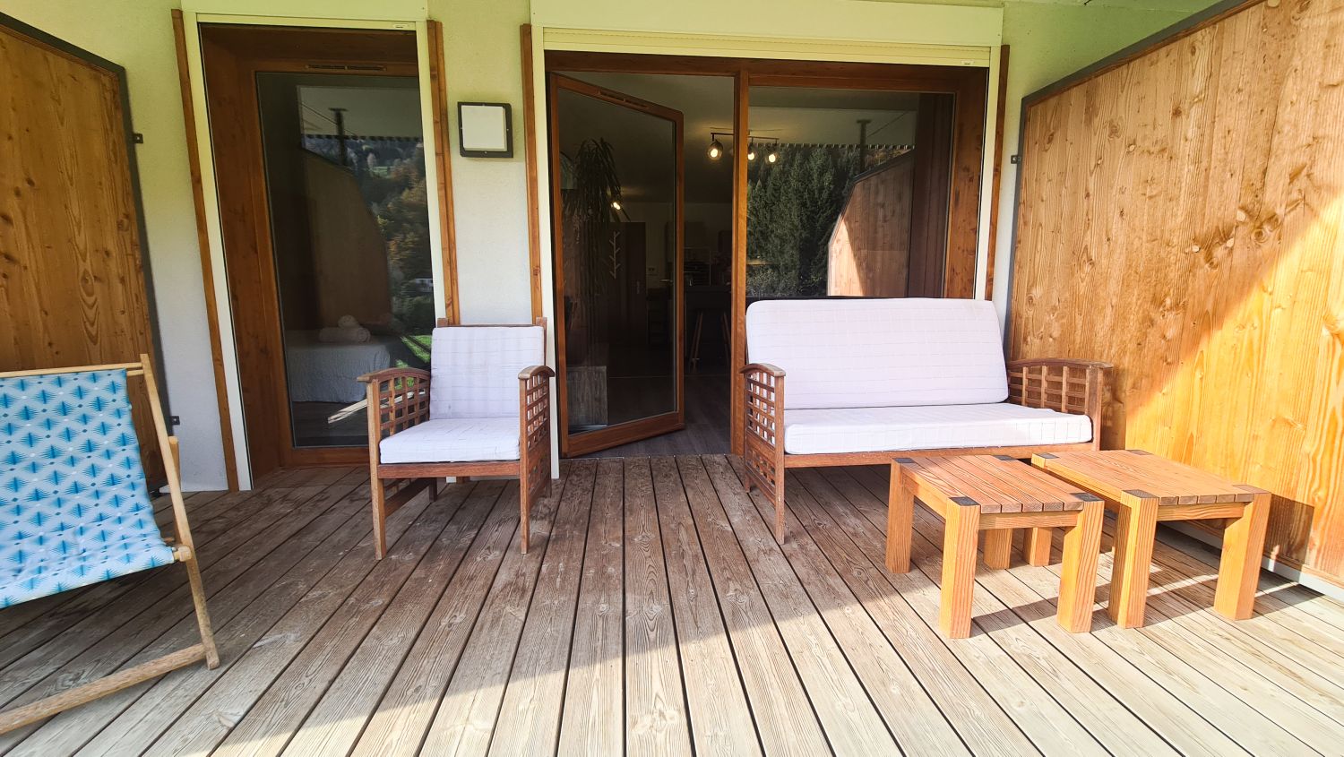 Petite terrasse avec vue dégagée sur la montagne et forêt, très calme.