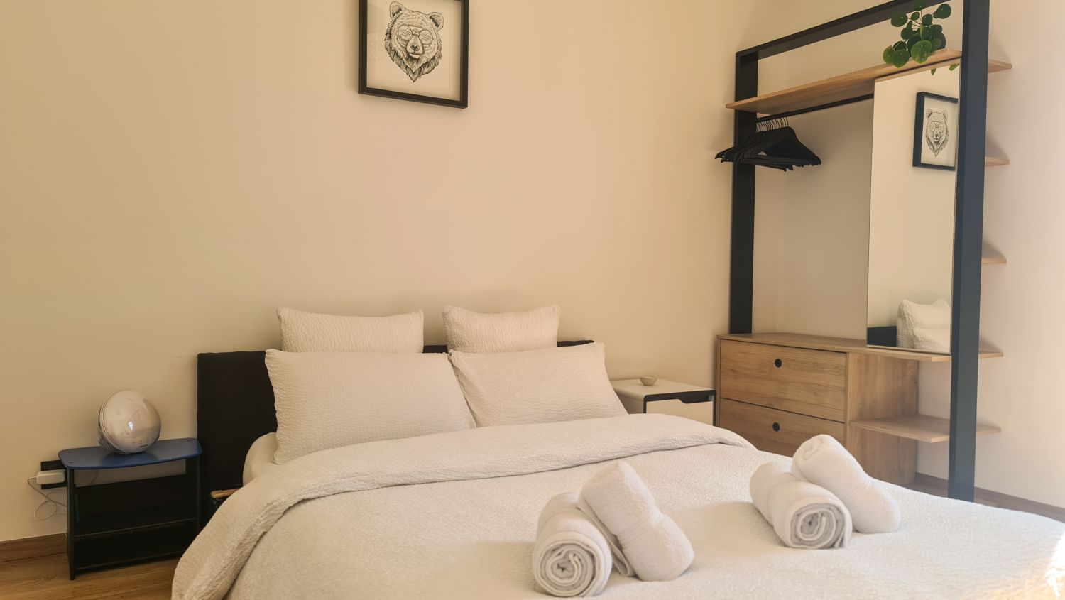 * 1 chambre pour 2 personnes avec couchage 140×200 (linge fourni, lit fait à l'arrivée).